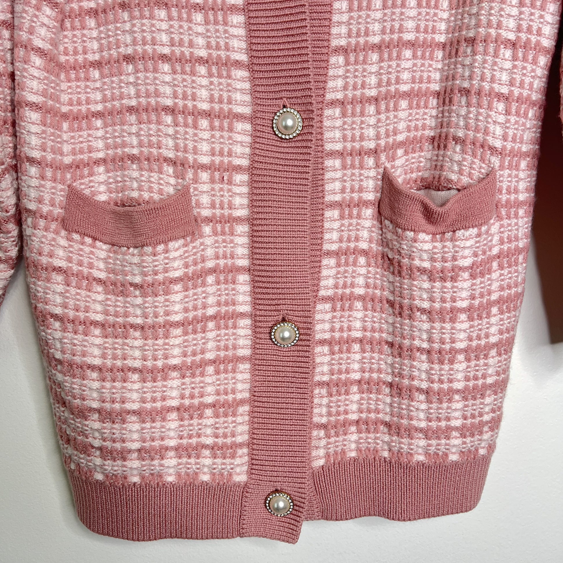 This beautiful Aritzia Lacer cardigan features a classic pink and white tweed plaid knit pattern. It has a V-neckline, two front patch pockets, and is fastened with four large faux pearl buttons with elegant gold-tone rims. The heavy-weight knit is perfect for layering and adding a sophisticated touch to your outfit.