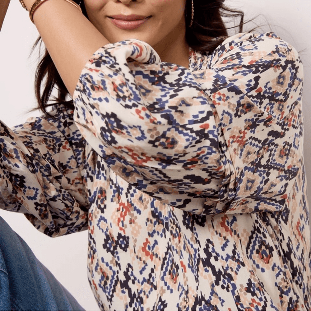 A multicolor ikat print elevates this stylish split neck blouse by EVEREVE, featuring a flowy fit, smocked collar, and three-quarter puff sleeves with pleated detailing. It will be your work-to-weekend favorite with trousers, jeans, and cargo pants.