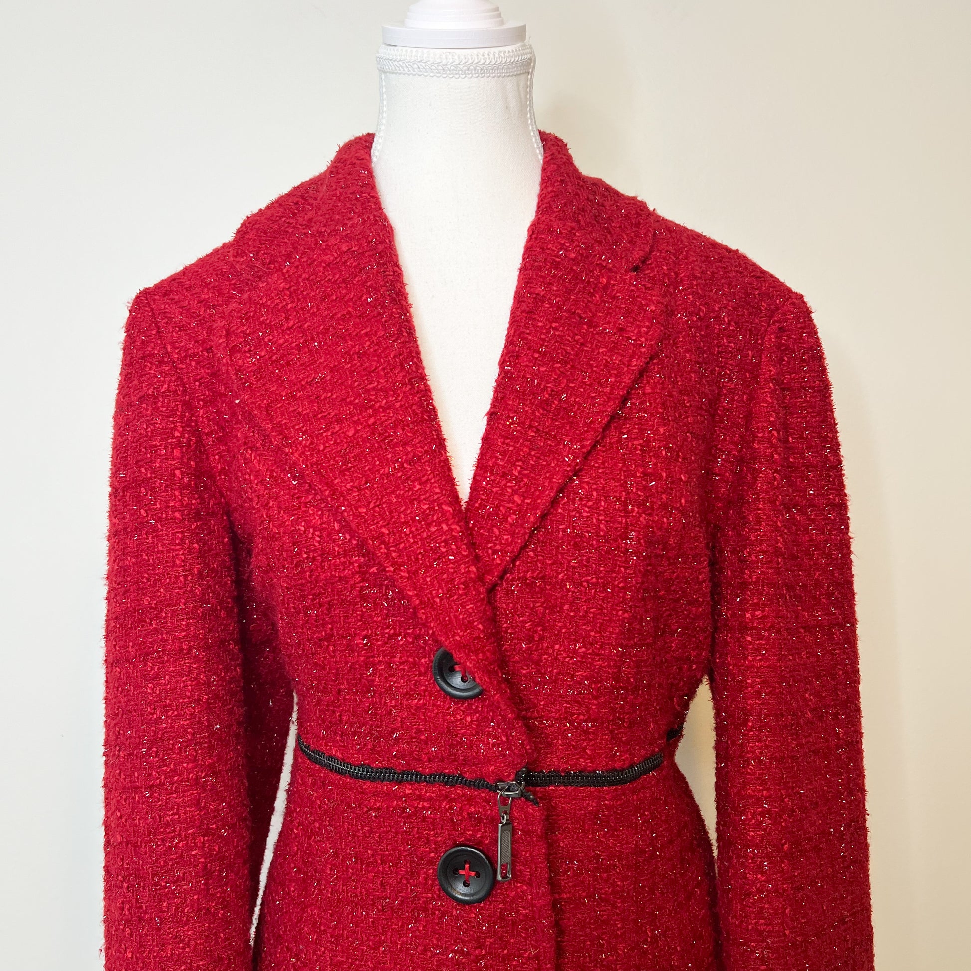tweed blazer, metallic tweed, red blazer, womens blazer, structured blazer, belted blazer, button front blazer, holiday blazer, elegant blazer, textured blazer, boucle blazer, dressy jacket, office blazer, statement blazer, tailored blazer, fall winter blazer, party blazer, classic blazer, wool blend blazer, fashion blazer, chic blazer Christmas holiday festive