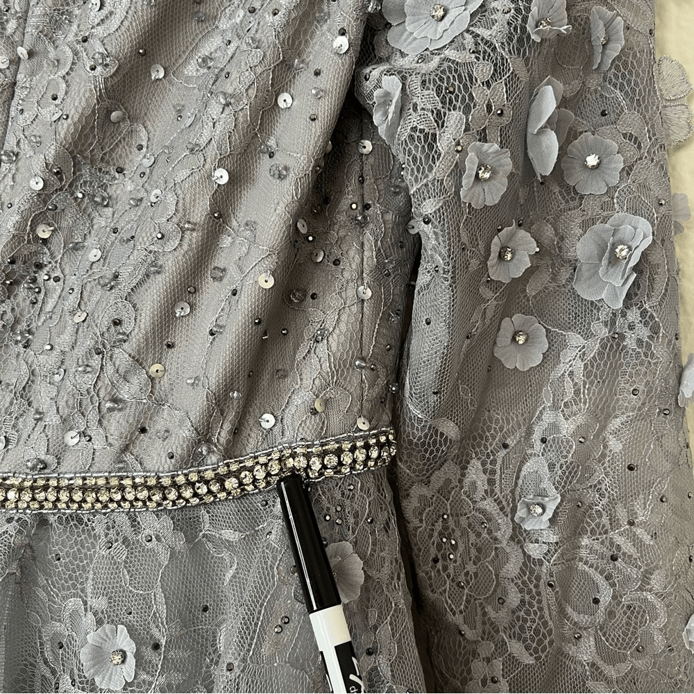 Elegant 3/4 sleeve a-line cocktail dress with a faux-wrap v-neckline, rhinestone-embellished belted waist, and gorgeous 3D floral applique and jewel accents throughout the lace overlay.