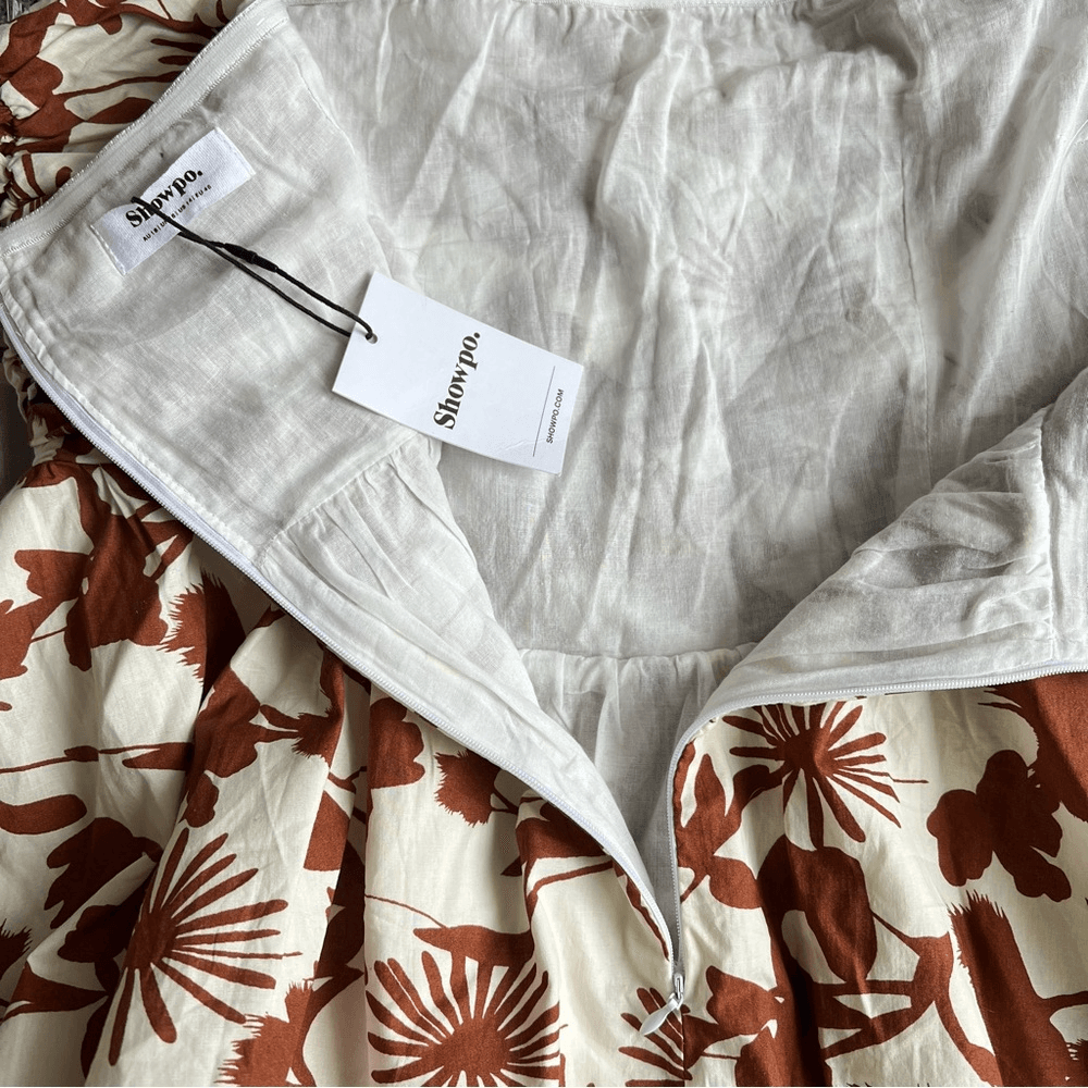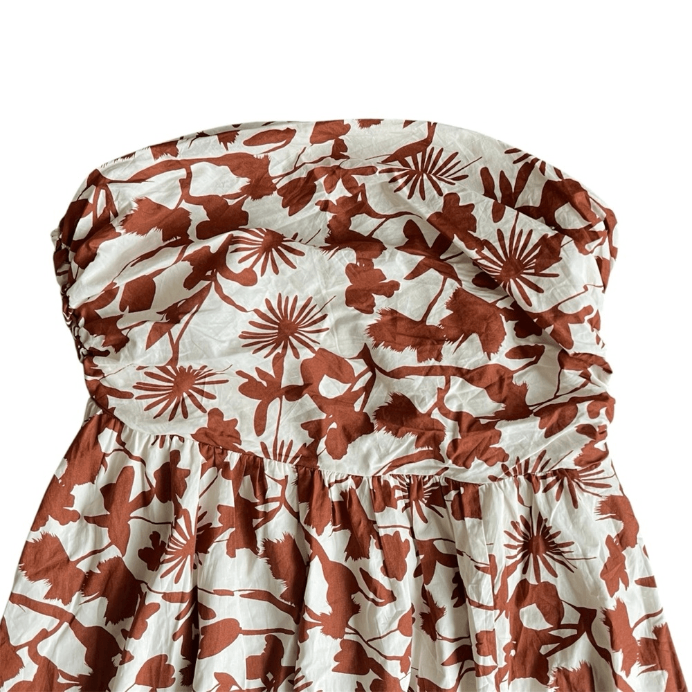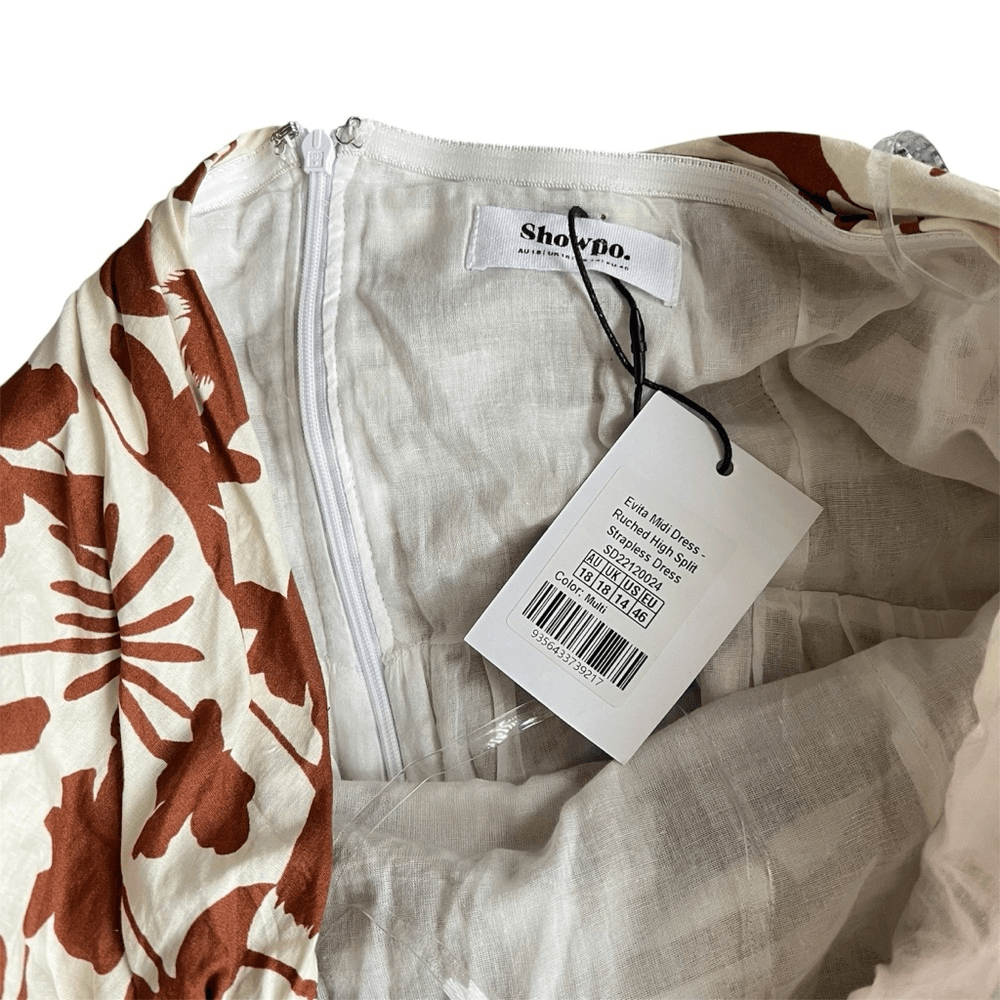 Showpo Evita Floral Midi Dress Ruched High Split Strapless NEW Size 14
