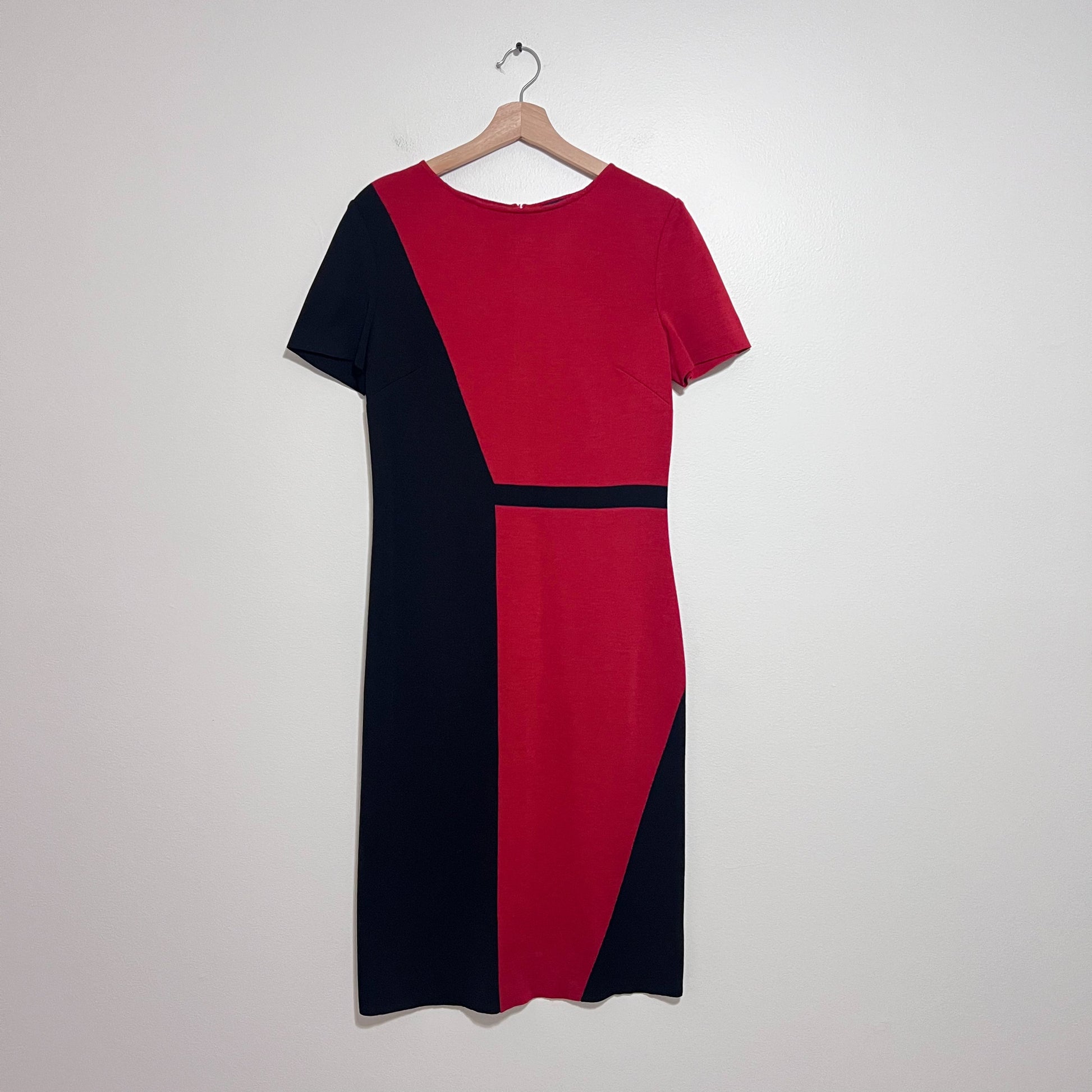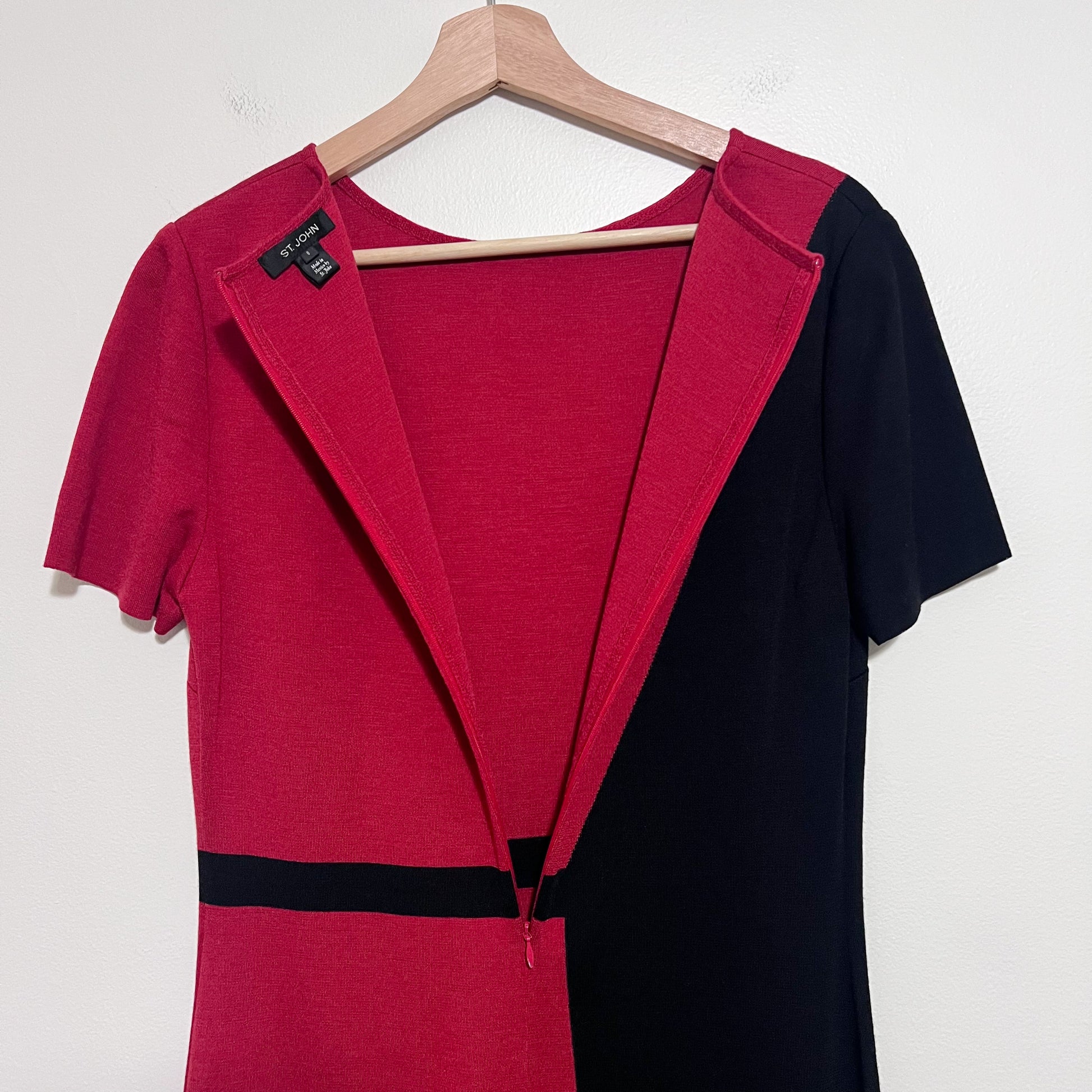 Keywords; classic, sophisticated, business chic, office wear, power dressing, elegant, timeless, luxury minimal, old money, st john dress, st john collection, milano knit dress, colorblock sheath dress, red black dress, designer work dress, luxury knit dress, office sheath dress, business professional dress, size 8 designer dress, career wear women, classic sheath dress