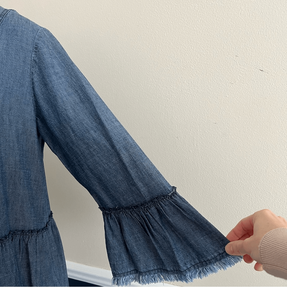 The Movie Colony Dress is an A line tiered chambray dress with fringe at the sleeves and hem